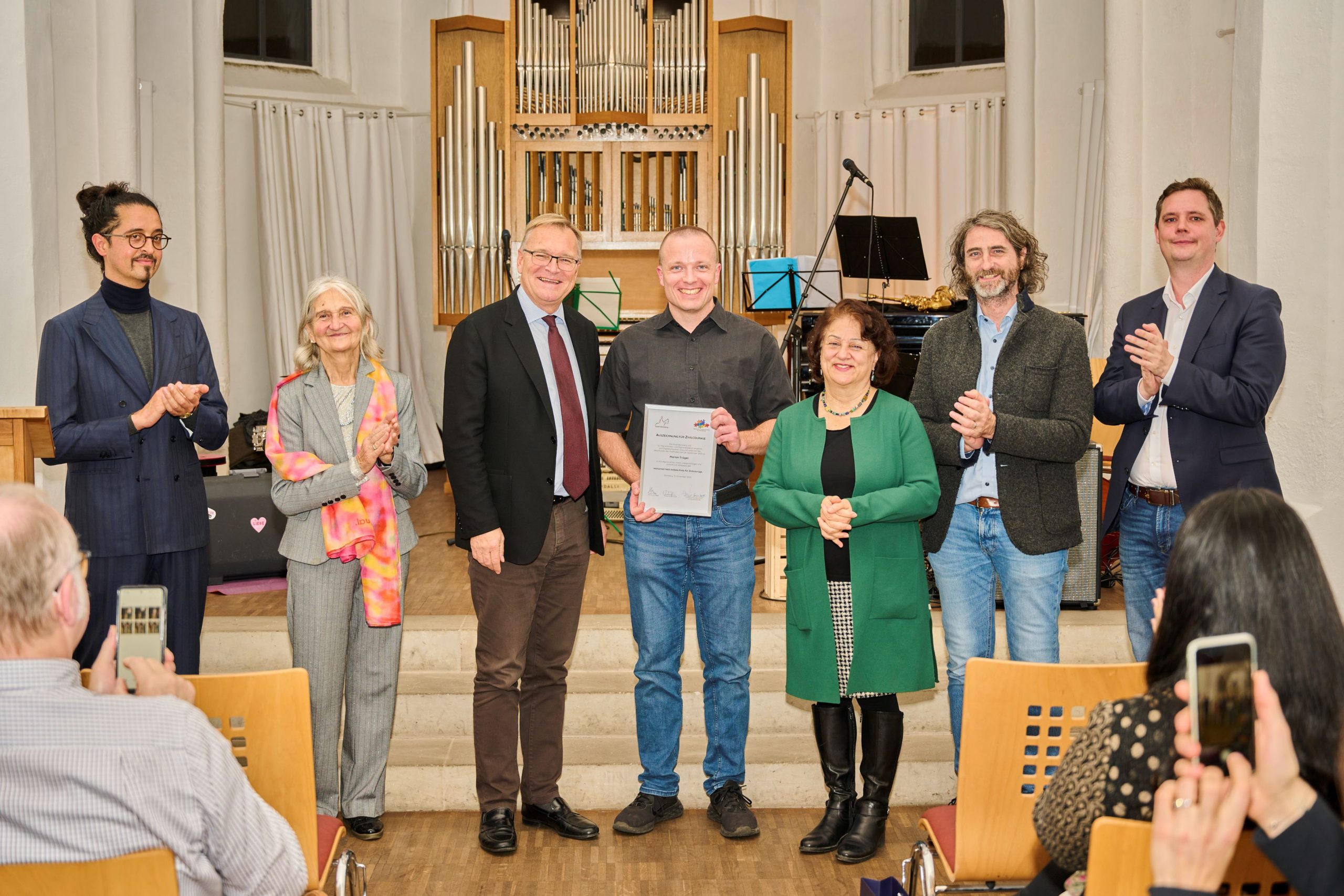 Oberbürgermeister Andreas Starke, Preis-Juryvorsitzender und Zweiter Bürgermeister Jonas Glüsenkamp sowie der Migrantinnen- und Migrantenbeirat der Stadt Bamberg zeichneten in der Johanniskapelle Marlon Tröger aus. Der 39-Jährige rettete eine Nachbarin aus einer lebensbedrohlichen Situation. „Ich danke Ihnen herzlich im Namen des gesamten Stadtrates, des Migrantinnen- und Migrantenbeirats sowie der gesamten Stadtgesellschaft, aber auch ganz persönlich, für Ihr mutiges Handeln und Einschreiten“, betonte Oberbürgermeister Andreas Starke bei der Verleihung des „Mohamed Hédi Addala-Preis für Zivilcourage“ 2025.