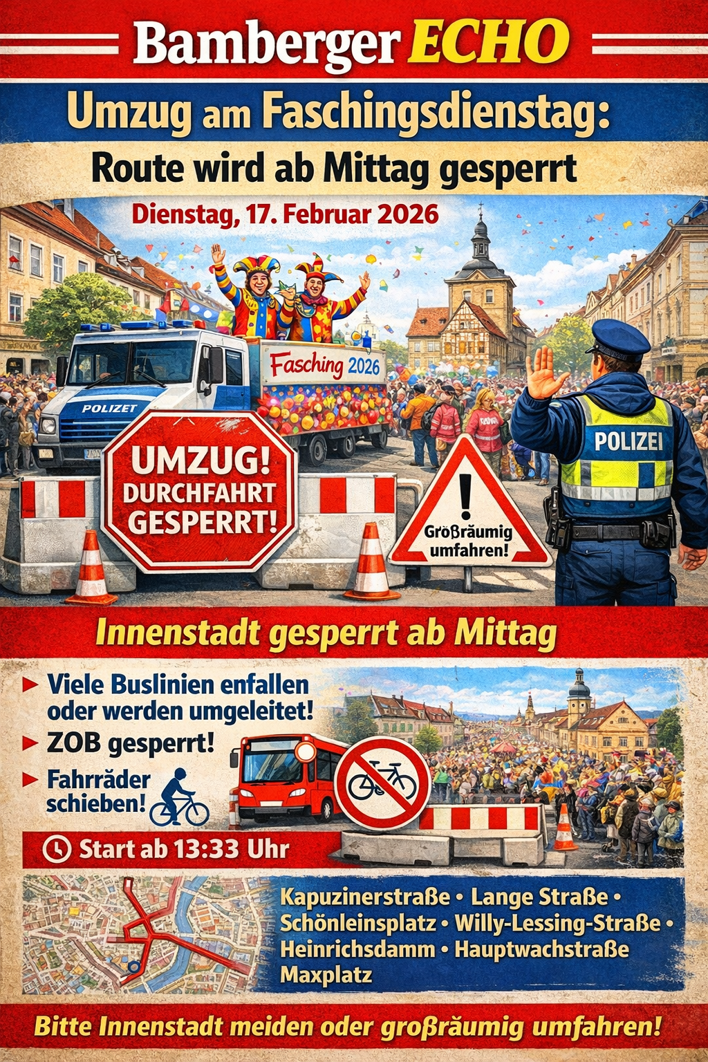 Der Faschingsdienstag, 17. Februar 2026, steht in Bamberg wieder ganz im Zeichen des Faschingsumzugs. Trotz regnerischer Prognose erwartet die Stadt Bamberg am Dienstag mit dem Umzug vom Stadtmarketing Bamberg den Höhepunkt des närrischen Treibens.