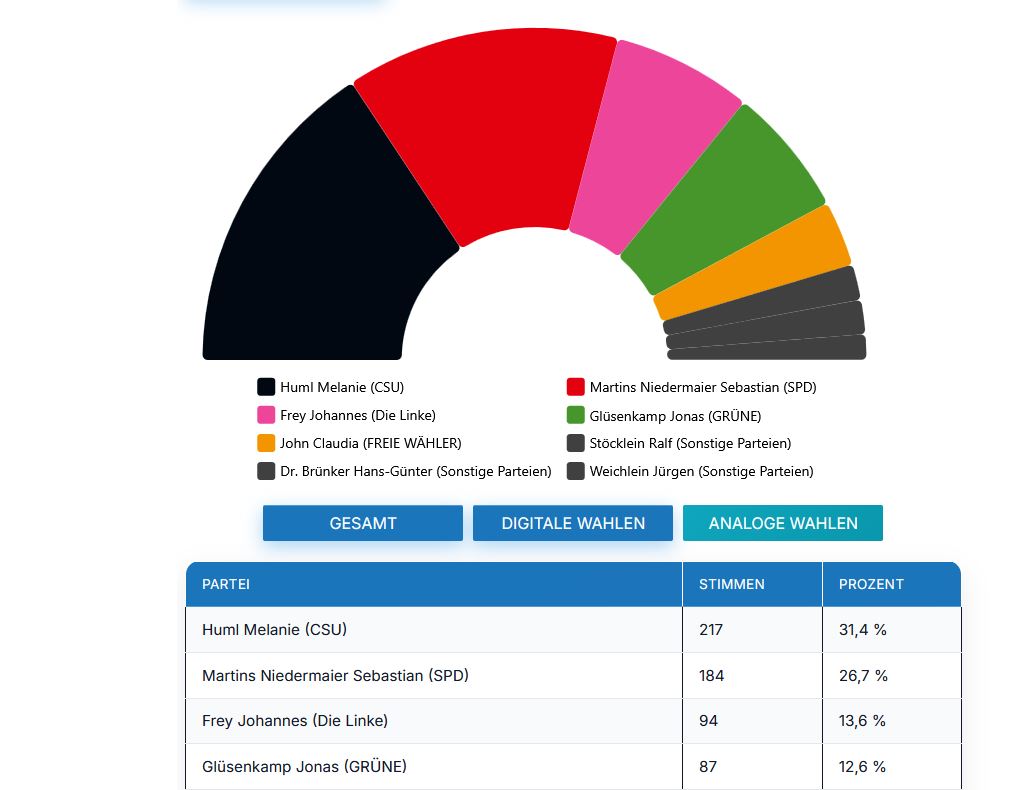 Spannend ist dabei auch die Dynamik dahinter: Die drei männlichen Bewerber aus dem eher linken Spektrum landen hinter Huml und nehmen sich gegenseitig Stimmen weg. Platz 2 belegt laut der veröffentlichten Reihenfolge SPD-Kandidat Sebastian Niedermaier, Platz 3 der Linken-Kandidat Johannes Frey. Der grüne Kandidat Jonas Glüsenkamp folgt dahinter und bleibt in diesem U18-Votum deutlich zurück.