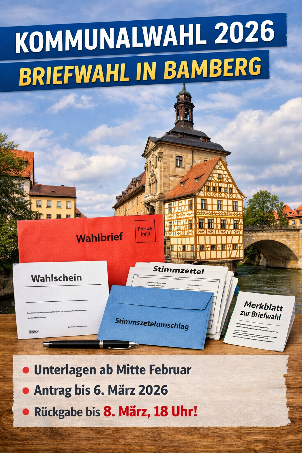 Für die Briefwahl ist das Wahlamt der Stadt Bamberg zuständig. Als Kontakt wird u. a. die Mailadresse [email protected] angegeben; als Anlaufstellen tauchen u. a. Luitpoldstraße 51 (Stadtverwaltung) sowie Maximiliansplatz 3 (Wahlamt) auf.