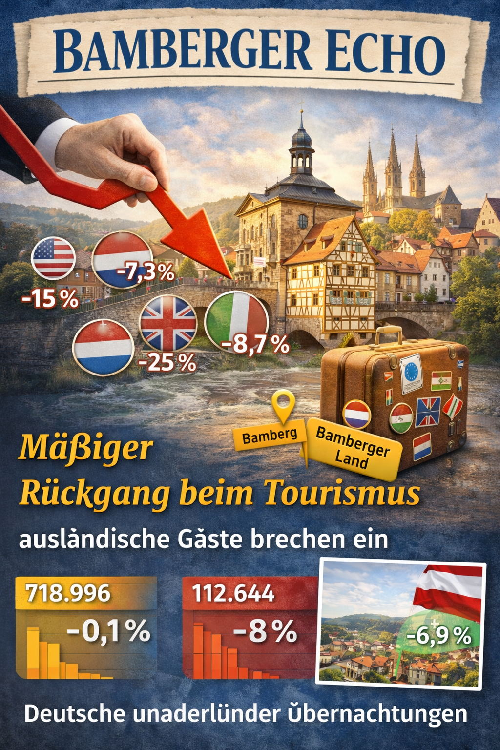 Der Tourismus in Bamberg und im Bamberger Land verzeichnet im Jahr 2025 eine leicht rückläufige Übernachtungsentwicklung, bleibt jedoch insgesamt auf einem weiterhin soliden Niveau. Insbesondere der Rückgang bei ausländischen Gästen sowie strukturelle Faktoren prägen die Entwicklung in Stadt und Landkreis.