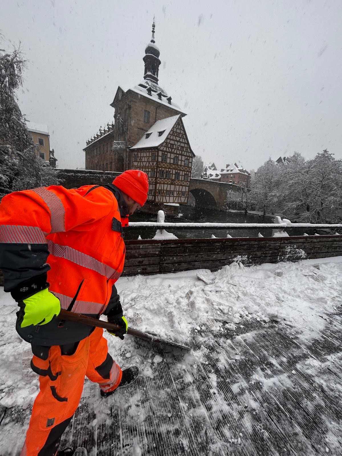 Mit einer aufgestockten Teamstärke von über 150 Mitarbeitenden bewältigt der Winterdienst im Stadtgebiet Bamberg den starken Schneefall zu Beginn der Woche. Auf Grund der Wetterlage ist am heutigen Montag, 26. Januar 2026, auch die komplette Müllabfuhr im Stadtgebiet ausgefallen.