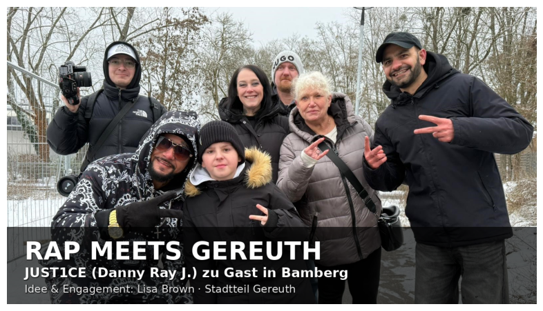 BAMBERG. Gereuth stand in diesen Tagen einmal nicht für die üblichen Schlagworte, die man dem Stadtteil manchmal vorschnell anhängt, sondern für Beats, Begegnung und einen richtig guten Moment für die Nachbarschaft. Mit dem deutsch-amerikanischen Rapper JUST1CE (Danny Ray J.) war ein Künstler zu Gast, der seine Wurzeln in Deutschland hat und familiär mit Mississippi (USA) verbunden ist.
